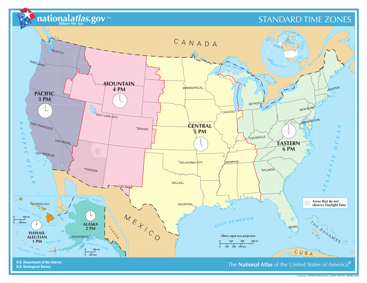 美國地域遼闊,本土橫跨西五區至西八區,共四個時區,再加上阿拉斯加時間(AKST,西九區時間)和夏威夷時間(HST,西十區時間),構成了美國復雜多樣的時區體系。這種劃分并非完全依照經線,而是在很大程度上照顧了各州的自然邊界,這就使得不同時區所覆蓋的州市大小和數量各不相同。